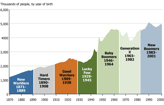 By virtue of when they were born, members of each generation live through unique times shaped by unexpected historical events, changing political climates, and evolving socioeconomic conditions. Generations also come in different sizes and changing mixtures of ethnicity, helping to shape the choices individuals will make in life. A generational perspective offers fresh insights into contemporary society by emphasizing both the distinctiveness of each generation in its particular historical context and the persistence of such distinctions across an individual’s life. When different generations respond in unique ways to common problems and choices, businesses, governments, and we as individuals need to recognize and understand such distinctions. This Population Bulletin highlights contrasting American generations of the 20th century, showing how each one influenced and reacted to the social and economic landscape over which we all must travel during our lives.