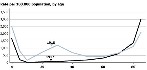 the people with the strongest immune systems.22 The death curve of this pandemic was “W-shaped,” peaking for babies and children under age 5, the elderly, and people ages 25 to 34 (see figure).