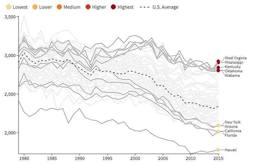 This data visualization shows that adult death rates in the U.S. South diverged from the rest of the country between 1980 and 2015, declining more slowly than in other regions. Users can explore state-level trends for men and women, and changes in individual state rankings.