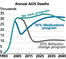 • Combining programs of all types with a not-yet-developed vaccine, hypothetically administered in 2012. The basic results do not change. A large medication program yields only modest advantages over a smaller medication program; roughly the same results as a modest condom-use program; and roughly the same results as a very modest combination program.