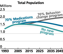The alternative to any program is not to do anything new. In the long run, this would lead to fewer annual deaths by 2046 than would the all-out medications-only program, but total population would be 400,000 people fewer, and life expectancy would be only 36 years instead of 40.