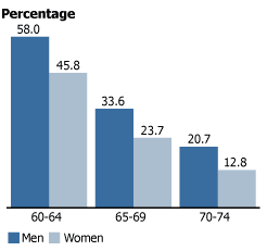 LFPR have risen substantially since 1994 both for men ages 62 and over and for women ages 60 and over. (For elderly women, the increase continues a trend that began in 1985.) Figure 1 shows the changes in men’s and women’s participation rates between ages 60 and 74 for the period 1994-2005.