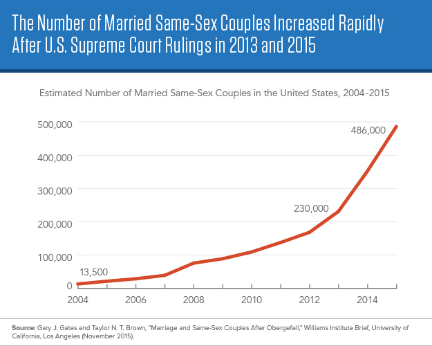In June 2015, the U.S. Supreme Court legalized same-sex marriage in every U.S. state; a 2013 ruling required the federal government to recognize state-sanctioned marriages of same-sex couples. Married same-sex couples totaled an estimated 486,000 by October 2015, representing 45 percent of all same-sex couples, up from the 2013 level of 230,000 married same-sex couples, 21 percent of the total (see figure).