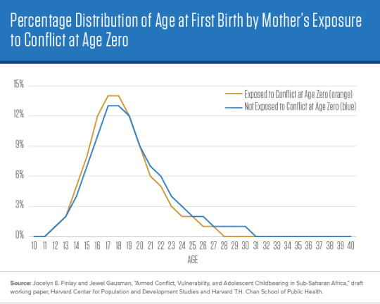 Finlay and Gausman hypothesize that the stress caused by exposure to armed conflict early in life affects women over the life course by weakening bonds between mothers and daughters, leading daughters to begin intentional childbearing at an earlier age. In view of multiple conflicts throughout sub-Saharan Africa and the connection between earlier ages of first births and higher fertility, conflict may be one reason fertility remains persistently high in the region.