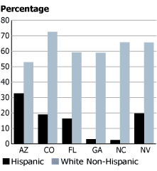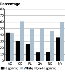 Furthermore, the share of births that were Latino increased in all states over the same period, rising by at least 7 percentage points in 16 states and by at least 10 percentage points in Nevada, Colorado, North Carolina, Arizona, and Georgia. The increasing share of Latino births in the United States reflects the aging of the white population, the youthful age structure of the Latino population, the relatively high fertility rates of Latinos, and the continuing inmigration of young Latinos. (See Figure 2 for a comparison of Hispanic and white non-Hispanic shares of total births in six states in 1993 and 2003.)