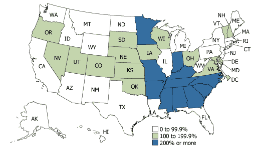 While 22 states and the District of Columbia saw declines in their total number of births between 1993 and 2003, all states and the District had increases in Latino births between 1993 and 2003. And many of the increases were quite significant. The number of Latino births at least doubled between 1993 and 2003 in 27 states, almost all of which were new-destination areas for Latinos (see Figure 1). Indeed, new-destination states such as Tennessee, North Carolina, South Carolina, Alabama, Arkansas, and Georgia had increases in Latino births of more than fivefold during the 10-year period.