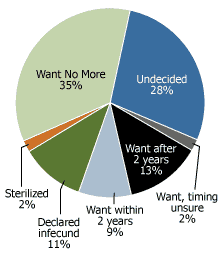 The CDHS measured women’s reproductive intentions by asking currently married women whether they want to have another child and, if so, how soon. Thirty-five percent of such women say they have had enough children (see Figure 2). Twenty-four percent say they want to have at least one more child. However, two-thirds of those women would prefer to wait at least two years before having another child or are unsure about the best timing for their next child. More than a quarter (28 percent) are not sure of whether they would like to have another child. Further studies should be conducted to learn more about these women and what kinds of information and services are appropriate to their needs.10