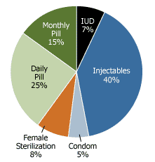 such as daily and monthly (Chinese) pills, condoms, IUDs, injectables, and female sterilization