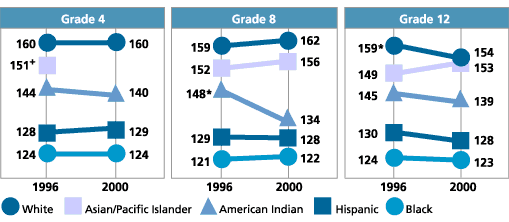 + Special analyses raised concern about the accuracy and precision of national Grade 4 Asian/Pacific Islander results in 2000. As a result, they are omitted here.
