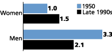 Trends in years of work since 1950 have been quite different for men and women (see table). There was a drop in men’s average work life from about 39 years in 1950 to 36 years in the early 1990s, followed by a reversal to about 37 years by the late 1990s. Women’s average work life, however, rose steadily and rapidly throughout the period, from about 14 years in 1950 to nearly 32 years by the late 1990s. Thus, whereas women’s work life was little more than one-third that of men in 1950, by the late 1990s it had grown to 86 percent of men’s.