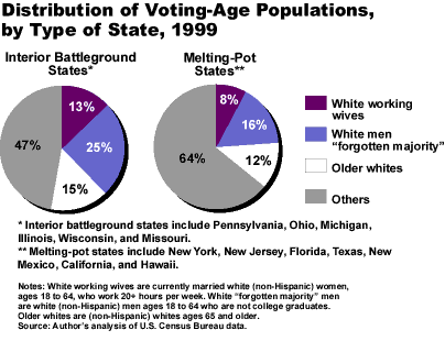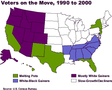 into selected “melting-pot” states; by shifts of white middle-class suburbanites from large coastal metropolises to fast-growing parts of the “New Sun Belt” (states in the South Atlantic and western regions); by the return of African Americans to the South; and by the nonmigration of some of the most sought-after swing groups of voters that George Bush and Al Gore are vying for.