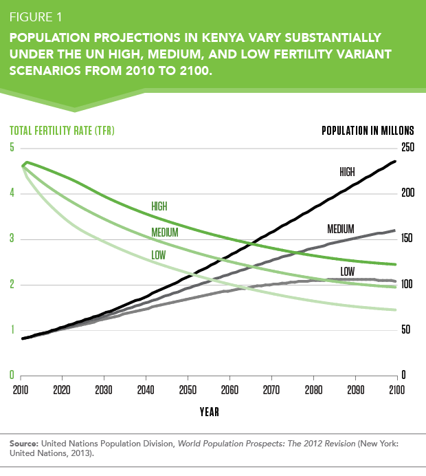 Because of the possible discrepancy between assumptions and actual trends, the UNPD publishes multiple projections every two years with differing fertility assumptions, including Low, Medium, and High Fertility variants. The Medium Variant, most often cited among the series, assumes a growth in the use of family planning that will result in reductions in fertility in patterns similar to what occurred in other countries. The Low Variant simply assumes that in each country the TFR is one-half child less than the Medium Variant at most periods in time, while the High Variant assumes that the TFR is one-half child more than the Medium Variant. Under these three variant scenarios, the assumed fertility in Kenya in 2050, for example, would range from 2.2 to 3.2 children per woman