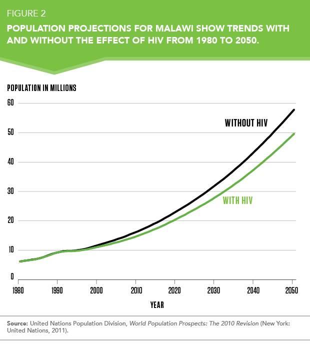 The HIV pandemic and its substantial impact on mortality in countries with high prevalence created the need to consider the future course of HIV infection and its treatment in mortality assumptions and population projections. In those countries with growing HIV epidemics during the 1990s, death rate assumptions were revised upward in population projections. Despite the rise in mortality, population growth continued, albeit at a slower rate due to the impact of HIV. Malawi