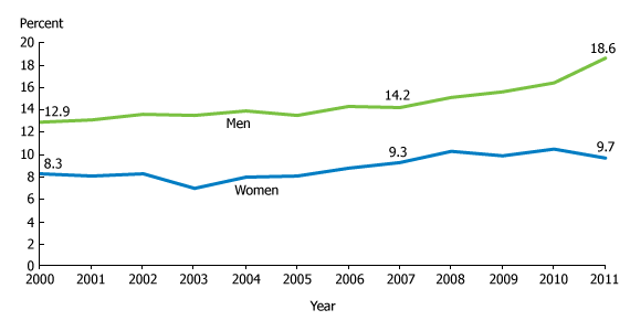 Share of Men and Women Ages 25-34 Living With Their Parents, 2000-2011